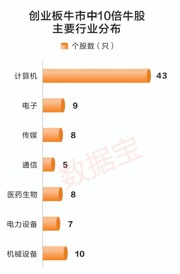 从个股表现来看,剔除牛市启动后上市的个股,创业板牛市中诞生了120只10倍牛股,其中逾半数股票来自TMT板块,典型代表股银之杰最高涨幅达60多倍。2019年的赛道牛市则有20只10倍牛股,其中12只个股为赛道股,典型代表股阳光电源涨超25倍。