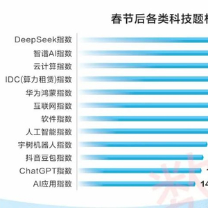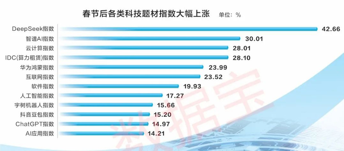 科技题材更是井喷式上涨,DeepSeek概念指数飙涨近43%,智谱AI、云计算、算力租赁、华为鸿蒙等众多科技类指数涨幅均超20%。