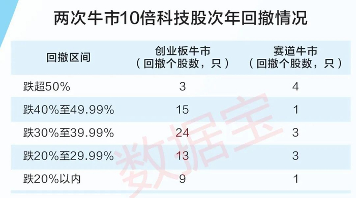 然而,投资科技股在全球资本市场中都有独特的“高波动高回报”的双面镜特征,其魅力与风险并存的特性值得关注。证券时报·数据宝通过对A股市场近两轮科技牛市中的10倍股进行梳理,揭示科技股的崛起逻辑和潜在的投资机会,同时也清晰地反映其潜藏风险。