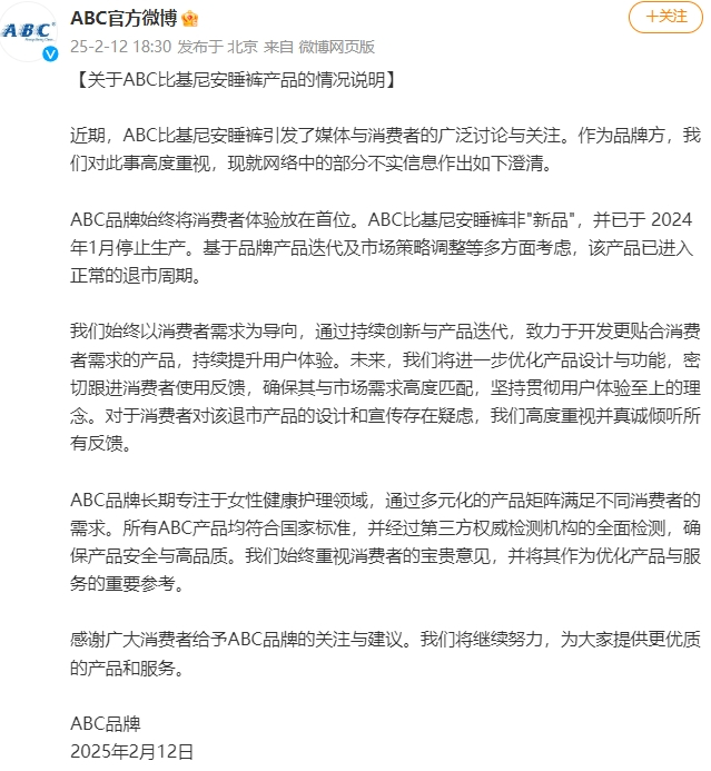 2月12日,@ABC官方微博 发布关于ABC比基尼安睡裤产品的情况说明,称ABC比基尼安睡裤非“新品”,并已于2024年1月停止生产。基于品牌产品迭代及市场策略调整等多方面考虑,该产品已进入正常的退市周期。