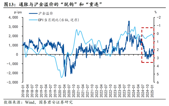 黄金长期趋势的决定因素转变为人民币汇率,当前沪金是对冲汇率预期的较好工具。当居民的还贷压力较高时,消费和资产配置能力都被压缩,表现为CPI和沪金溢价的“脱钩”;而当提前还贷水平回到低位后,CPI和沪金的关系又会“重连”。当前,CPI和沪金溢价皆处低位,如果风险资产的财富效应和货币政策没有带来通胀弹性的显著提升,那么沪金依然具有性价比。报告名称:《通胀弹性与沪金溢价》 报告日期:2025年2月9日