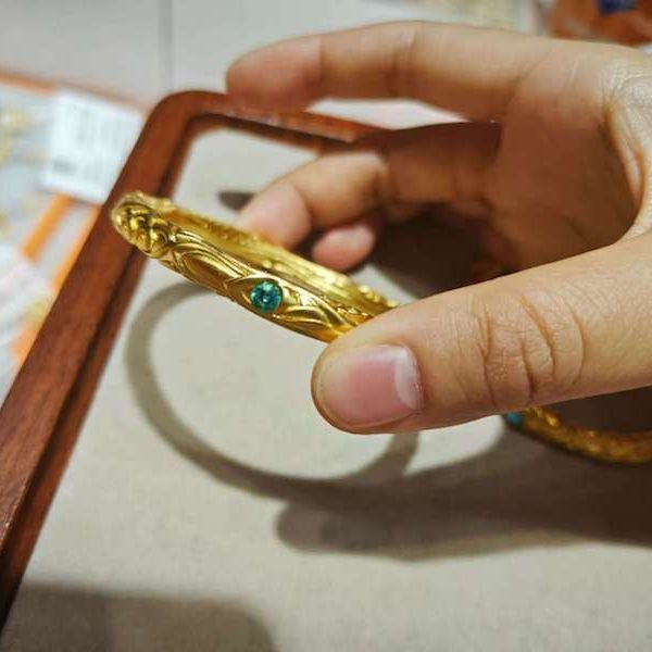 小慧拿着计算器给记者算了一笔账,“今天(11日)水贝金价是690元/克。因为该款手镯要用到镂空和镶嵌的工艺,工费是25元,加上这个手镯上镶嵌的三颗绿色锆石,需要附加180元,算下来60g的哪吒手镯售价为43080元。如果要实心的镯子,就要做到100g,售价就要7万元多了。”