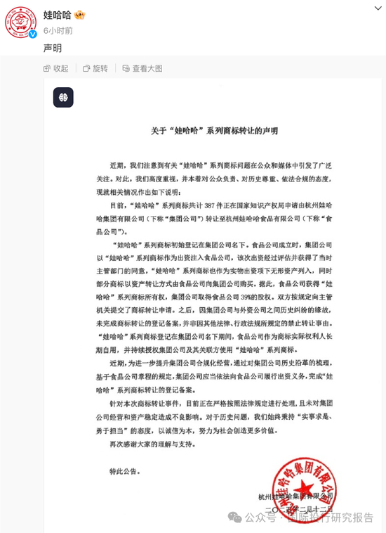 声明透露,387件“娃哈哈”系列商标目前在国家知识产权局申请由杭州娃哈哈集团公司转让至杭州娃哈哈食品有限公司。