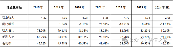 低温乳制品:它是阳光乳业的第一大业务,公司的毛利主要来自于它,近些年已经达到90%以上。从2018年到2023年,低温乳制品业务的营业收入从4.22亿元增长12%至4.74亿元,CAGR为2.37%。该项业务的收入、毛利占比和毛利率均较为稳定。详见下表、图。