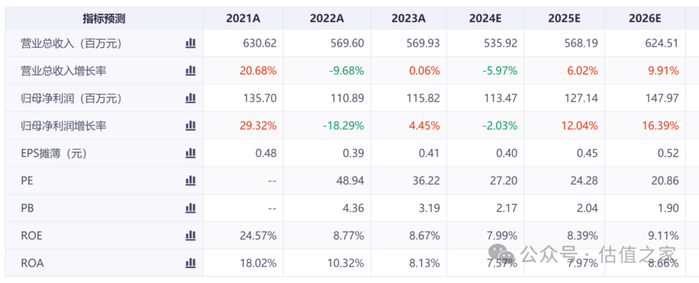 根据iFind预测,2024~2026年的营业收入分别为5.36亿元、5.68亿元、6.25亿元,归母净利润分别为1.13亿元、1.27亿元、1.48亿元,PE分别为27.2、24.28、20.86。公司的成长预测依然不高,仍然以稳定为主。