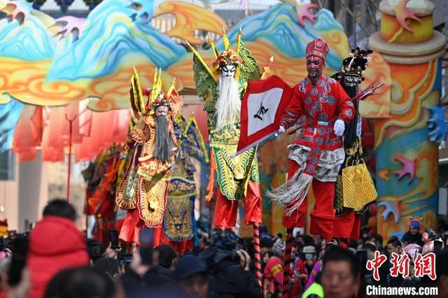 2月12日,甘肃兰州老街,高跷表演吸引民众驻足观赏。当日是农历正月十五元宵节,兰州老街举行丰富多彩的社火展演,迎接元宵节的到来。中新社记者 九美旦增 摄