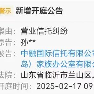 日前,有人以营业信托纠纷为名把中融国际信托菜限公司和大唐盛世(青岛)家族办公宇有限公司临沂分公司告上法庭,公告显示,该案将地2月17日上午在山东临沂市兰山区法院开庭审理。