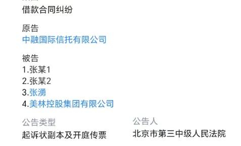 据悉,因为贷款合同纠纷,中融信托把3名张姓人员和美林控股集团有限公司告上了法庭。