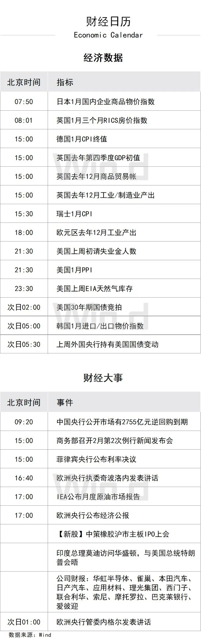 1、美国1月通胀意外上升。美国1月未季调CPI同比升3%,预期升2.9%,前值升2.9%;季调后CPI环比升0.5%,预期升0.3%,前值升0.4%;未季调核心CPI同比升3.3%,预期升3.1%,前值升3.2%;季调后核心CPI环比升0.4%,预期升0.3%,前值升0.2%。通胀数据公布后,交易员预计美联储将减少政策宽松力度,将下次美联储降息时间从9月调整至12月。