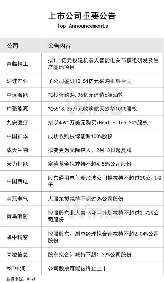 2、明晟公司(MSCI)公布了2月份指数审议结果。其中MSCI中国指数新纳入恒玄科技、供销大集、阿特斯、极兔速递、润和软件、晶合集成、四川长虹、永辉超市8只股票,剔除安井食品、安图生物、华熙生物、凯莱英和华阳股份等20只股票。调整将于2月28日收盘后生效。