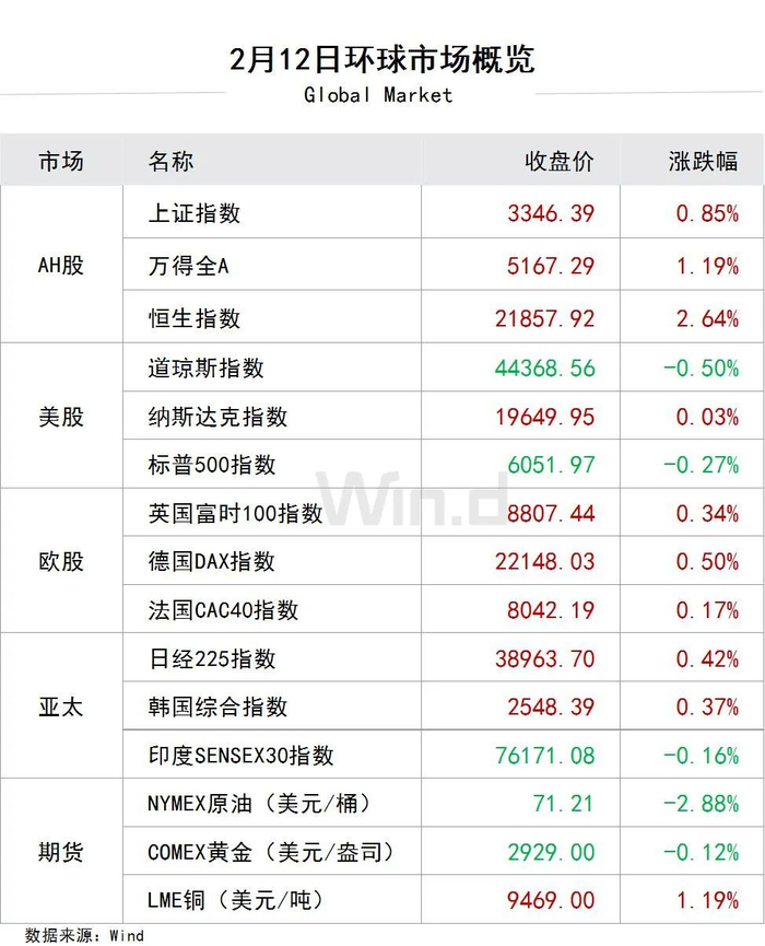1、美国三大股指收盘涨跌不一,道指跌0.5%报44368.56点,标普500指数跌0.27%报6051.97点,纳指涨0.03%报19649.95点。卡特彼勒跌超2%,家得宝跌逾2%,领跌道指。万得美国科技七巨头指数跌0.1%,亚马逊跌超1%,英伟达跌逾1%。中概股普遍上涨,亿航智能涨超21%,世纪互联涨逾13%。