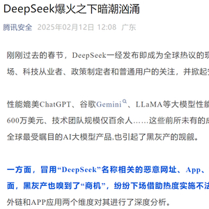 2月12日,腾讯安全团队发布警告称,春节期间,DeepSeek引发广泛关注,成为全球热议的现象级产品。但这也引起了黑灰产的觊觎。