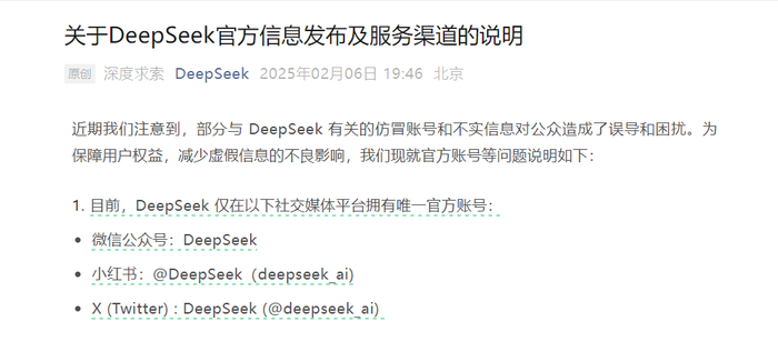 此外,2月6日晚,DeepSeek官方微信公众号发文,说明并澄清近期市场上出现部分与DeepSeek有关的仿冒账号和不实信息。