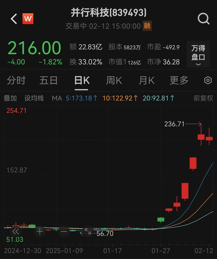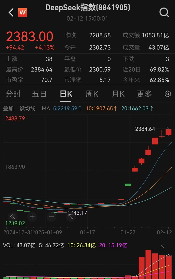 2025年1月27日至2月12日,Wind DeepSeek指数(1月26日发布)7个交易日暴涨58.29%,DeepSeek概念股并行科技同期暴涨234.73%。