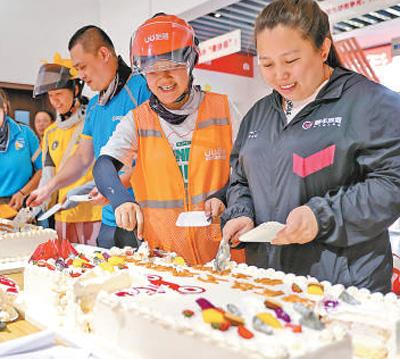 河北秦皇岛市海港区,快递员、外卖员在骑手驿站里享用蛋糕。