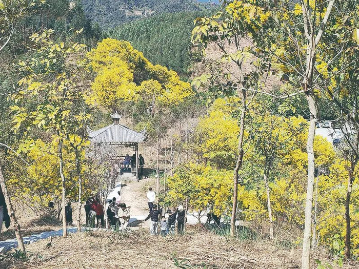 如果说金合欢是春天的使者,那么樱花则是春日里最温柔的笔触。12日,记者来到凤凰茶谷示范带深处的棋盘村,一片片樱花林正以最饱满的热情绽放,将整个山谷装点得如梦似幻。