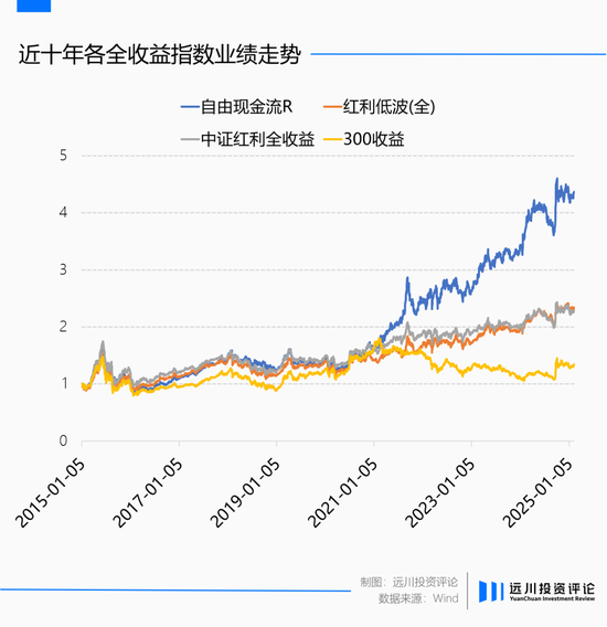 兼具稳定性、增长潜力以及有一定择时效果的特征最终也取得了更好的历史收益。数据显示,2015年以来国证自由现金流全收益指数近十年累计涨幅达363.62%,年化超17%,显著高于中证红利、红利低波和沪深300的全收益指数。