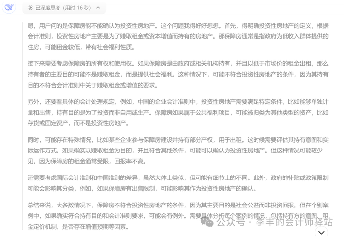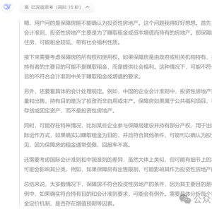 DeepSeek回答会计问题实例1:保障房是否能够确认为投资性房地产