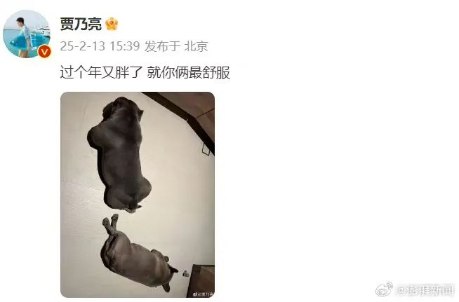 2月13日,贾乃亮在社交平台发博晒出自己的宠物狗,并配文:“过个年又胖了,就你俩最舒服。”