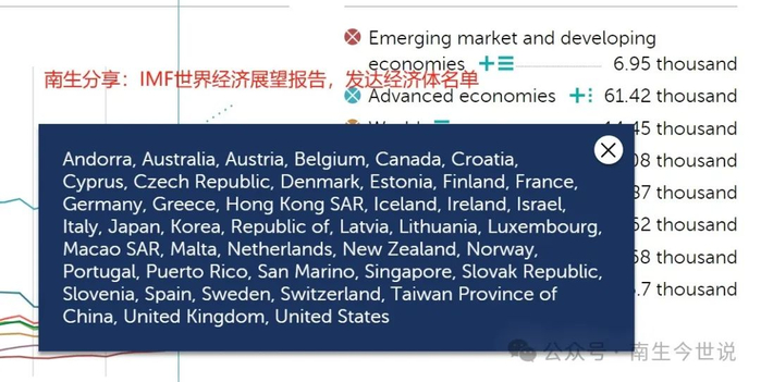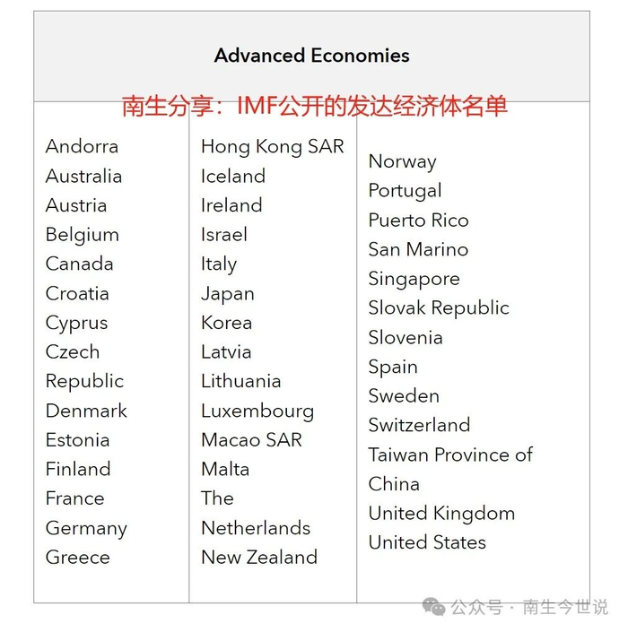 在2023年年初的时候,南生再度引用国际货币基金组织公开的报告,提到“发达经济体的名单扩张至40个”,新增了“安道尔”。葡萄牙、希腊、立陶宛、拉脱维亚,这四国继续在名单中。