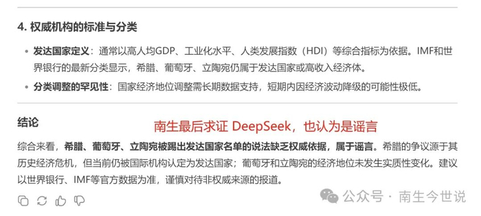 最后,南生求证DeepSeek也得出是谣言的观点。它指出:谨慎对待非权威来源的报道。
