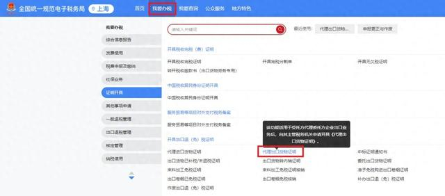 登录新电子税局后,点击【我要办税】-【证明开具】-【开具出口退(免)税证明】-【代理出口货物证明】。