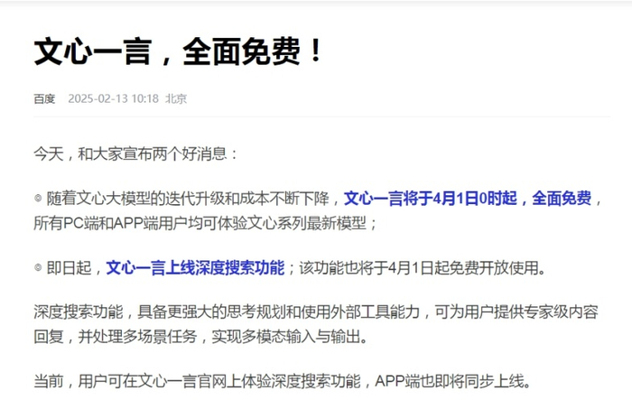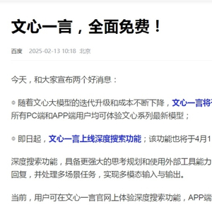2月13日,百度宣布,随着文心大模型的迭代升级和成本不断下降,文心一言将于4月1日0时起,全面免费,所有PC端和APP端用户均可体验文心系列最新模型。