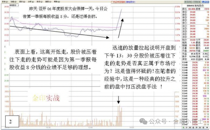 这是06以年度股东大会停牌一天。之后公告第一季报每股收益8分,还是过得去的。表面上看,这高开低走,股价被压着往下走的走势可能是因为第一季报每 股收益8分钱的业绩不足够的理想。迅速的放量拉起说明开盘到下午13:30分股价被压着往下 走的走势是否真正厲于市场行 为?这是值得怀疑的!在筆者的 经验中,这是一种经典的拉升之 的益中打压洗盐手法。