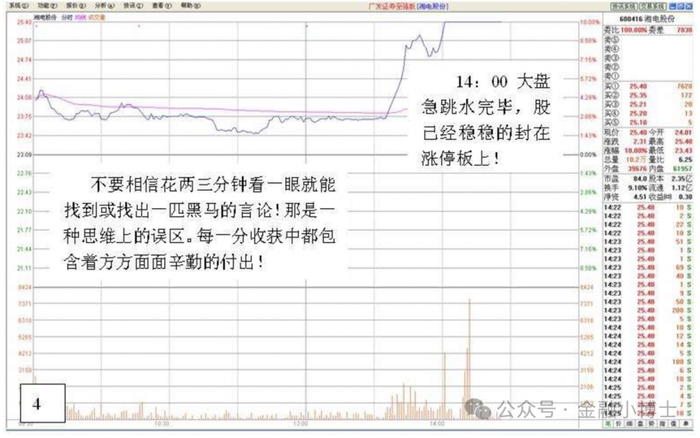不要相信花两三分中看一眼就能找到或者找出一匹黑马股的言论。那就是一种思维上的误区,每一分钟收获中包含着方方面面辛勤的付出!14:00大盘急跳水完毕,股己经稳稳的封在涨停板上!