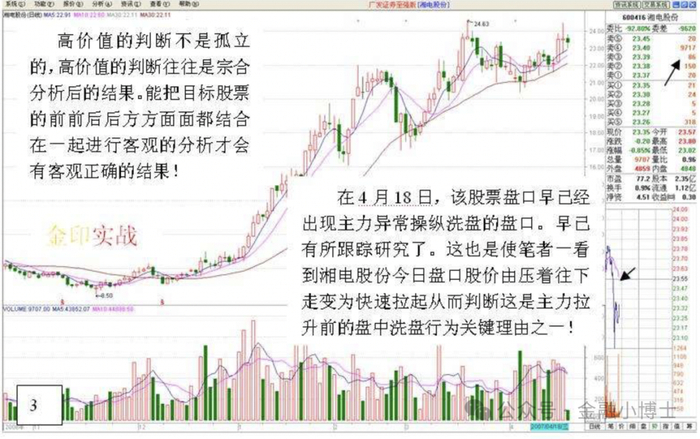 高价值的判断不是孤立的,高价值的判断往往是宗合 分析后的结果。能把目标股票 的前前后后方方面面都结合 在一起进行客观的分析才会 有客观正确的结果!在4月18日,该股票盘口早已经出现主力一场操作洗盘的盘口。早已经有所有研究了,这也是之前有经验的朋友可以一看湘电股份盘口股价由压着往下走编委快速拉起从而判断这是主力拉升前的盘中洗盘行为关键理由之一!