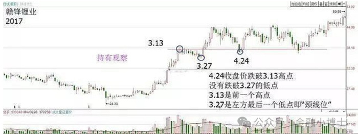 第二种调整低点跌破前一个高点,但是没有跌破颈线,即多空僵持,未来大概率会出现横盘震荡,此时制定持有观察,可以逢高做T。