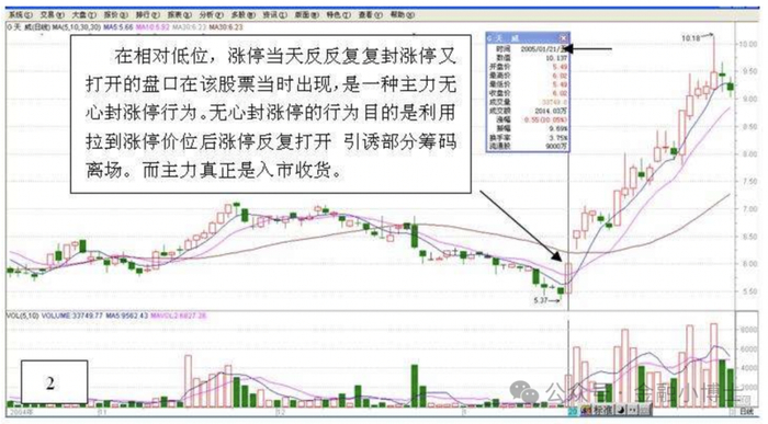 在相对低位,涨停当天反反复复封涨停叉打开的盘口在该股票当时出现,是一种主力无 心封涨停行为。无心封张停的行为目的是利用 拉到涨停价位后涨停反复打开引诱部分筹码 离场。而主力真正是入市收货。