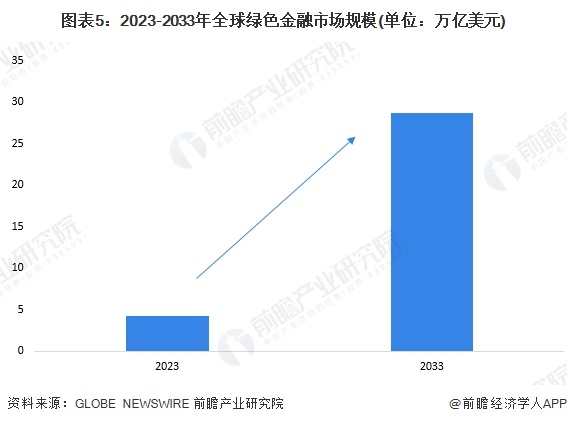 当前,全球推进碳中和目标步伐明显加快,绿色贷款、绿色债券、可持续投融资等绿色金融市场驶入快车道,进而推动全球绿色金融行业的蓬勃发展,根据GLOBE NEWSWIRE的数据,到2033年,全球绿色金融市场规模将超过28万亿美元。