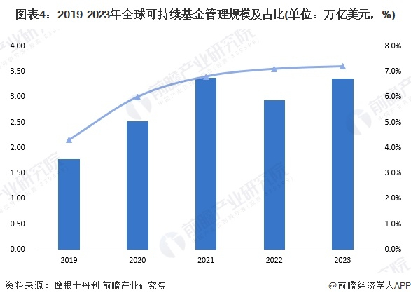 可持续基金与传统基金不同,因为其在追求可持续目标的同时,也寻求资金回报。在这一广泛的基金类别中,一些基金的关注领域较窄,仅聚焦于环境保护;此外,还有一个子类专门关注减缓气候变化。然而,尽管可持续性正成为投资策略的主流,但可持续投资基金仍只占投资基金领域的很小一部分,但其占比已呈现逐步上升的趋势。根据摩根士丹利的数据,2023年,全球可持续基金管理规模已达到3.36万亿美元,占基金总管理规模的7.2%。