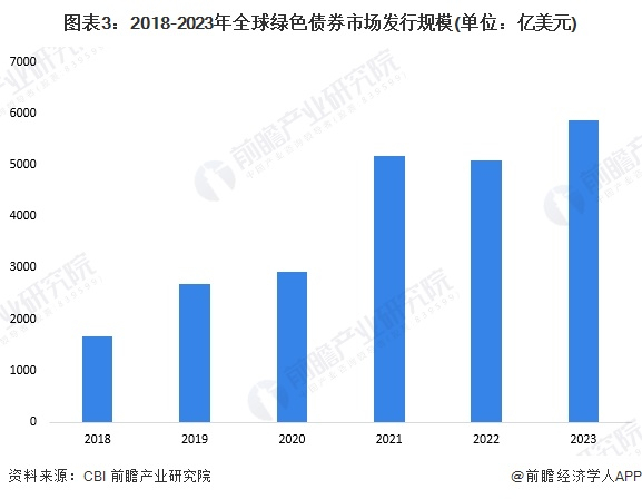 根据CBI发布的《全球可持续债务市场报告2023》,2018-2024年,全球绿色债券市场发行规模呈现波动上涨趋势,2021年以来全球绿色债券发行规模持续突破5000亿美元,其中,2023年全年,符合CBI标准的绿色债券的年发行量达到5876亿美元,同比增长15%。