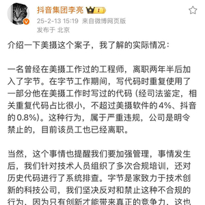 同日抖音副总裁李亮发文回应称,抄袭系一名曾在美摄工作过的工程师离职两年半后加入字节跳动。在字节工作期间,写代码时重复使用了部分在美摄工作时写过的代码。目前该员工也已离职。