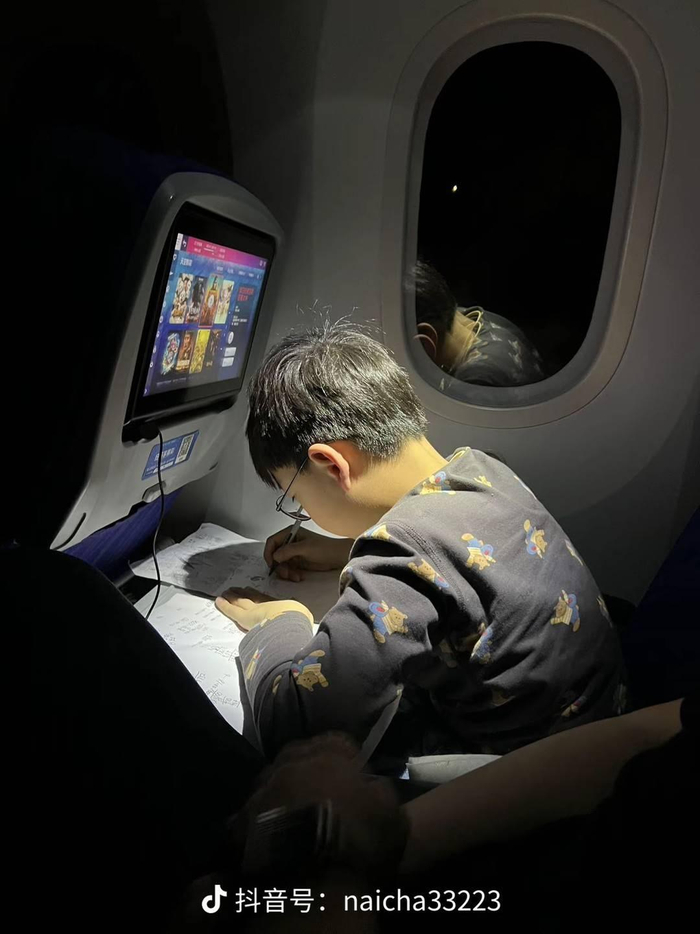 河南的罗女士也拍下了儿子在飞机上“赶工”的画面。2月9日,从布达佩斯飞广州的航班上,当时已是北京时间的晚上,飞机上大部分人都睡着了,而罗女士正在读四年级的儿子却打开阅读灯,在小桌板上完成当天数学打卡的任务。“感觉他在飞机上写作业的效率还挺高的。”