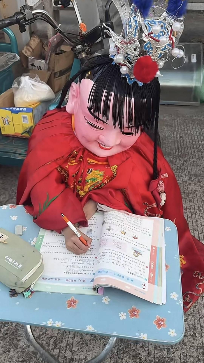 2月9日,福建网友“爱与自由”拍下了一位“游神小太子”在写寒假作业(图据网友)