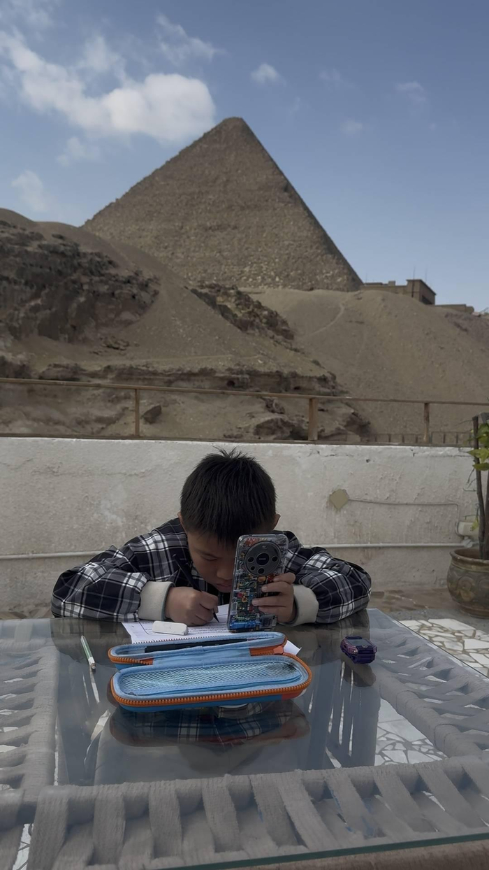 冯先生的儿子“小阿懒”在金字塔前赶作业(图据受访者)