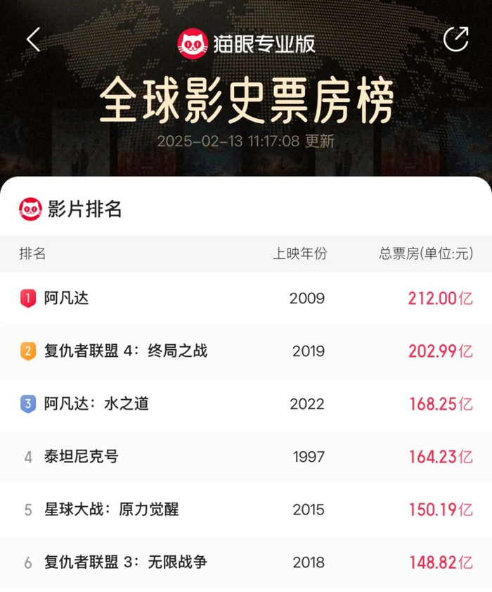 目前,猫眼专业版上《哪吒2》的预测票房已经超过160亿元,如最终达到这个数字,则可成为全球影史票房榜第五名,仅次于《阿凡达》《复仇者联盟4:终局之战》《阿凡达:水之道》和《泰坦尼克号》。