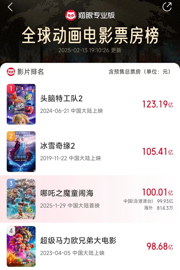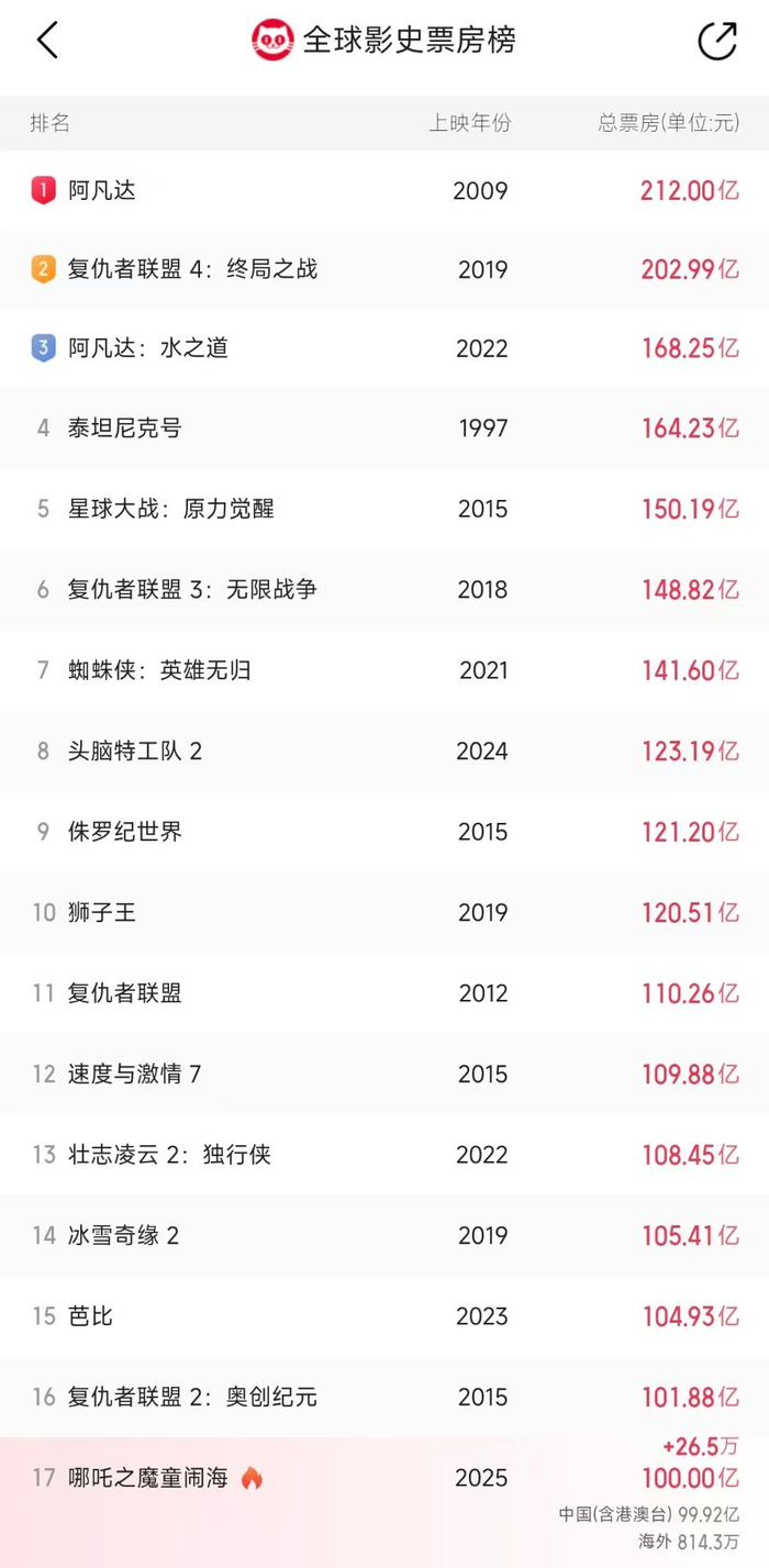 票房破100亿元 《哪吒2》挺进全球影史前17名!光线传媒或狂揽20亿元营收