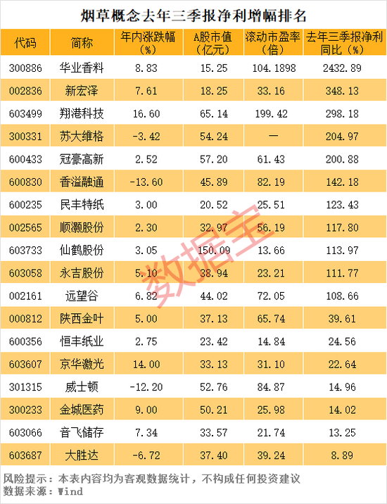 从基本面来看,有18只概念股去年三季报净利同比增长,华业香料、新宏泽、翔港科技、苏大维格、冠豪高新等个股均增超100%。