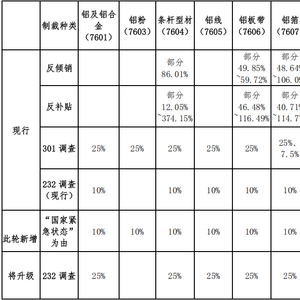“232”制裁涉及的铝商品包括:未锻轧铝及铝合金(HTS 7601),铝条杆型材(HTS 7604)、铝线材(HTS 7605)、铝板带(HTS 7606)、铝箔(HTS 7607)、铝管(HTS 7608)等铝材,铝制管子附件(HTS 7609)、铝制绞线、电缆、编带及类似品(HTS 7614.10.50、HTS 7614.90.20、7614.90.40、7614.90.50)等铝制品,铝铸件(HTS 7616.99.51.60),铝锻件(HTS 7616.99.51.60 和7616.99.51.70)以及铝制保险杠和车身冲压件(HTS 8708.10.30、8708.29.21)等铝部件;