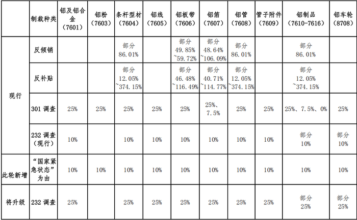 “232”贸易制裁产品主要是铝及铝合金(7601)、绝大多数铝材产品(7604-7608)、少数铝制品和铝部件;“国家紧急状态”为由新增的10%关税则几乎覆盖所有商品。