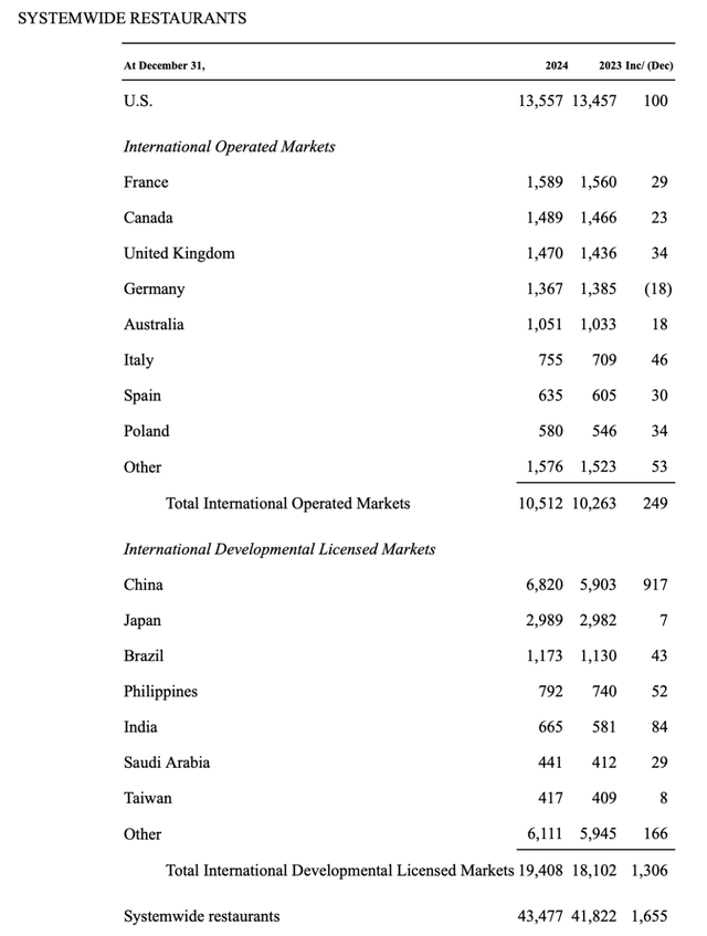 数据显示,麦当劳全球系统内门店总数从2023年的41822家增长至2024年的43477家,共增加了1655家,其在国际市场的扩展势头良好,尤其是特许经营领域增长显著。