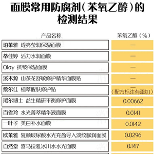本次检测结果显示,有10款面膜检出了苯氧乙醇,含量在0.00420%~0.707%之间,均未超出1.0%的标准限值。薇诺娜、瑷尔博士均有微量检出,检出值分别为0.00420%和0.00662%;齐叶雅为0.707%,含量相对较高。