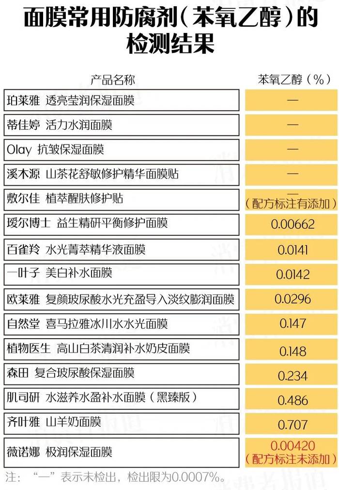 但是,敷尔佳、薇诺娜2款面膜中苯氧乙醇的标示与检出情况有所出入。