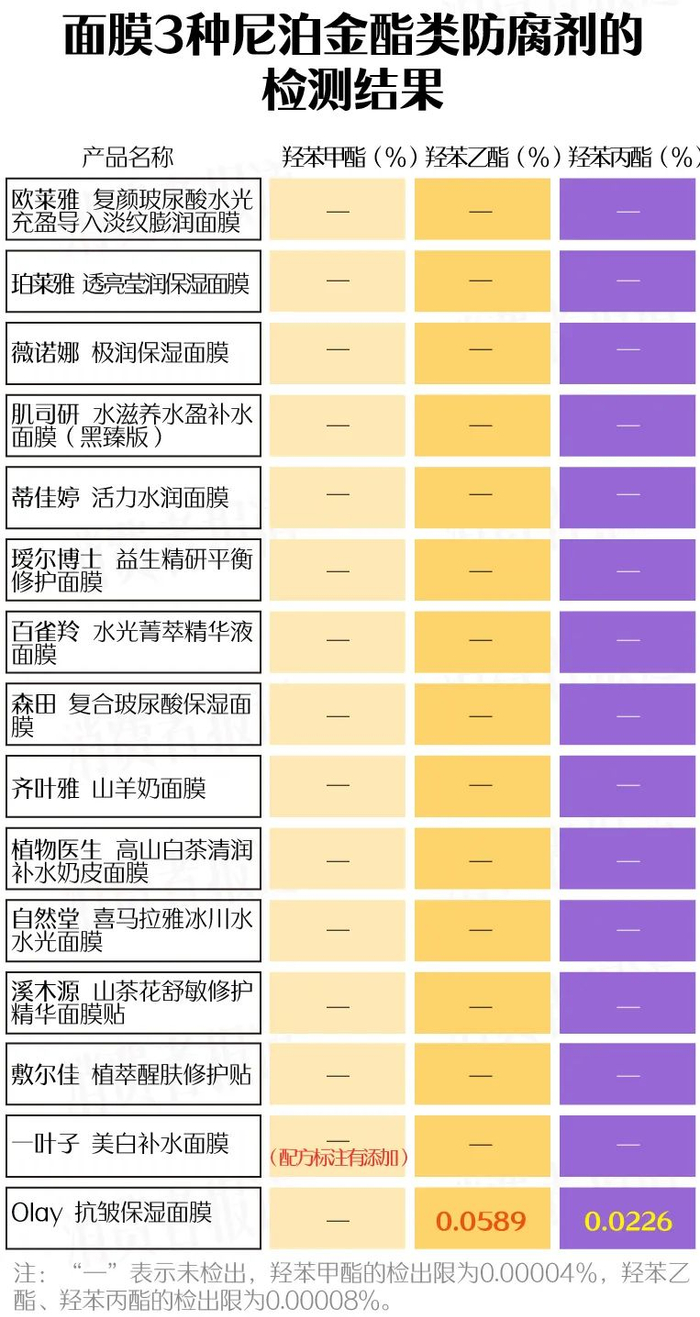 4、15款面膜中仅Olay检出羟苯乙酯、羟苯丙酯,这两种成分属于尼泊金酯类防腐剂,其安全性有一定争议。