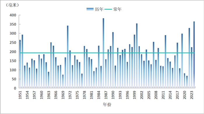 1951~2024年5月海南省平均降雨量变化图(单位:毫米)