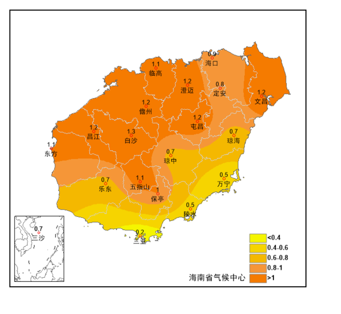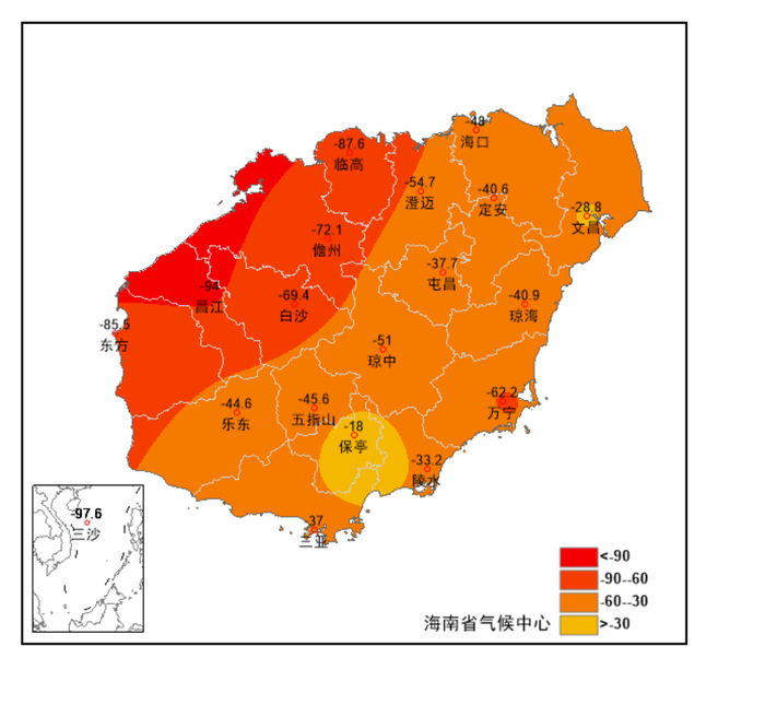 8月海南省无热带气旋影响,全省平均降雨量仅134.7毫米,较常年同期偏少55.4%,为历史第三少值,西北部市县偏少尤其严重。月平均气温29.1℃,较常年同期偏高1.3℃,突破历史同期最高纪录,有16个市县达到或突破当地8月历史极值。